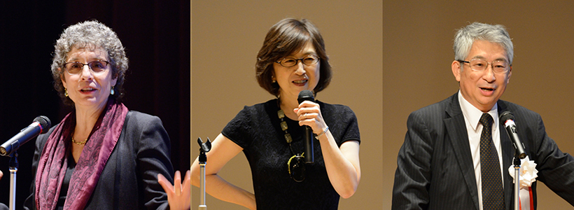 記念講演会では、アナリー・サクセニアン カリフォルニア大学バークレー校スクール・オブ・インフォメーション学部長が「次世代に向けた高度専門職業人・経営管理人材の教育」と題して基調講演を行いました。「これからのビジネススクールはこれまでのそれとは異なり、デザイン思考、学際的問題解決、チームワーク、経験学習とリフレクション、倫理とデザインにおける価値という五つの専門性を重視するべきだ」とのお話がありました。次に、南場智子 株式会社ディー・エヌ・エー取締役会長が、自らの起業体験をもとに「京大ビジネススクールを私が好きにして良いと言われたら」と題して特別講演を行いました。講演の中で、南場取締役会長は「コンサルタントの経験やビジネススクールでの学びは必ずしも起業では通用しなかった。だから自らビジネスを実行するということを中心にすえた、起業ベースの大学院をつくりたい」と提起されました。続いて、小林潔司 経営管理研究部・教育部教授が、「文理融合型ビジネススクールの発展をめざして」と題して特別報告を行い、「学問の文理融合はとても難しいが、ビジネス教育は文理融合なしにはありえない」と話しました。講演会の最後には卒業生の3名による特別セッションがあり、赤坂美保氏(5期生)による「グローバルM&Aの仕事で活躍するとともに育休ママが学ぶMBA講座の展開について」、小間裕康氏(4期生)による「電気自動車メーカー GLMを起業経営について」、ソボダチョイ氏(1期生)による「P&Gを経てエモーション、健康をキーにした起業独立について」との報告がありました。同講演会は、まさしく「起業」が未来をつくるという強いメッセージを来聴者に訴えるものとなりました。