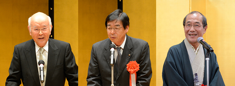 次に行われた記念式典は、京都大学交響楽団の弦楽四重奏によるハイドンの「日の出」、エルガーの「愛の挨拶」の演奏で始まりました。若林靖永 経営管理研究部長・教育部長の開式の辞のあと、まず、阿曽沼慎司 理事が産官学連携における同研究部・教育部の展開について触れ、大学としての祝辞を述べました。来賓である幸田博人 みずほ証券株式会社代表取締役副社長が「寄附講座を通じて同研究部・教育部と連携して、さまざまな有意義な教育プログラムの開発等に取り組んできたこと」、浅野敦行 文部科学省高等教育局専門教育課長が「専門職大学院制度の意義について触れ、同研究部・教育部が経営分野の専門職大学院として大きな成果を上げていること」、伊藤文雄 一般社団法人ABEST21理事長が「同法人がすすめる経営分野専門職大学院の認証評価の仕組みについて触れ、同研究部・教育部の審査結果が2校しかないA評価であること」、山田啓二 京都府知事の代理として参加された山内修一 副知事が「京都府下での観光、道路等公共インフラの管理などについて同研究部・教育部と連携した取り組みがすすめられていること」など、それぞれ祝辞を述べられました。