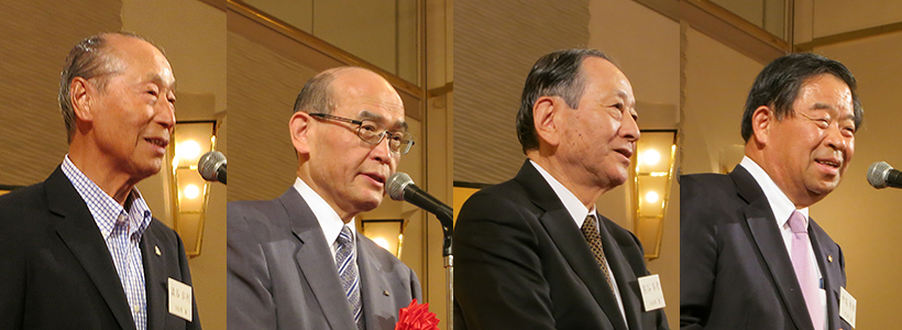 左から、開会挨拶をする澁谷会長、来賓挨拶をする谷本名誉会長、乾杯の発声をする熊谷副会長、閉会の挨拶をする中島副会長