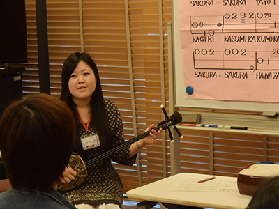 まず参加者たちは「勘武乃の会」による長唄「元禄花見踊」の演奏を鑑賞し、三味線の歴史や構造についての簡単な講義を受けました。その後、三味線を演奏するチームと長唄を唄うチームに分かれて、それぞれ交代で代表的な日本の歌である「さくらさくら」の演奏方法を習いました。