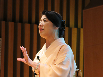 今回は、今中美栄 京都光華女子大学健康科学部管理栄養士学科長を講師に迎え、「知ってるとお得な「食情報」! -食事の選び方と健康管理-」をテーマとして講演を行い、日ごろの食事の大切さや食事による栄養摂取のコツなどについて、学生や研究者を具体例に挙げ詳細に解説いただきました。