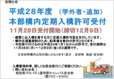 本学では、頻繁に出入構を要する方に対して、事業年度ごとに定期入構許可を行っています。今回、学外の方を対象に、追加で本部構内の定期入構許可証を発行することとしました。構内交通量規制のため、駐車場台数内の許可となります。