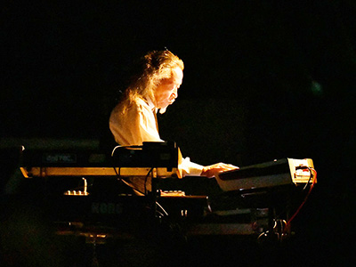 「古事記と宇宙」とは、喜多郎氏の楽曲「古事記」に合わせて宇宙のさまざまな映像・画像を同時上映するという映像コンテンツで、柴田一成 花山天文台長の発案と喜多郎氏とのコラボレーションのもと、花山天文台と学術情報メディアセンターとの学内共同研究成果として2015年8月に完成したもので、芸術作品としてだけではなく、全編を鑑賞すると天文学入門になるように映像や画像が選ばれています。2016年には英語版DVDとライブコンサート用バージョンが完成し、同コンサートで初めての披露となりました。また、舞踏家の三上賀代氏が、喜多郎氏の演奏に合わせて素晴らしい舞踏を披露されました。