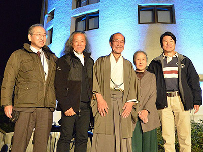 コンサート最後の集合写真(左より柴田天文台長、喜多郎氏、門川市長、三上氏、土井特定教授