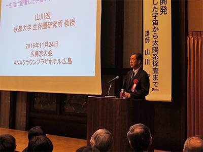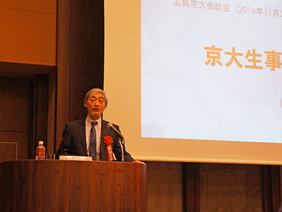 広島市のホテルにおいて、2015年に引き続き、広島京大会主催・本学共催の公開講演会、および平成28年度広島京大会総会が開催されました。広島京大会は、広島県下に在住する、または在住していた京都大学(旧帝国大学、新制大学、大学院)の卒業生を会員とした同窓会です。