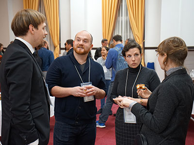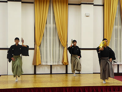 交歓会は、三橋紫 国際戦略本部副本部長の司会・進行によって始まりました。山極壽一 総長の開会挨拶では、創造性を涵養する本学の伝統的な教育・研究環境をこれからも保っていくために、世界中のさまざまな言語・概念について闊達な意見交換を望むことなどが述べられ、会場は一体感に包まれました。続いて湊長博 理事・副学長の乾杯の発声の後は、参加者それぞれの研究内容などをテーマに会場内に談笑の輪が広がりました。昨年度に引き続き、子どもを持つ研究者のために託児室を設けたことにより、夫婦や家族での参加がしやすくなり、交流もより一層広がりのあるものになりました。また、会の途中には、本学能楽部狂言会の学生達により、狂言「呼声」が披露され、懇談に華を添えました。