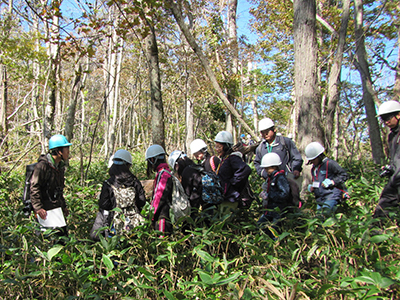 2016年は定員30名を上回る66組104名の応募があり、当日は23名の参加がありました。概要説明の後、2班に分かれ、教職員の案内で約2kmの観察コースを2時間半ほどかけて散策しました。参加者は散策中の解説に耳を傾け、たびたび質問をしては理解を深めました。参加者からは、「楽しく過ごせ2時間があっという間だった」、「木が生きている、というのをリアルに感じられた」などの感想が寄せられました。