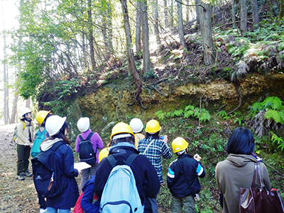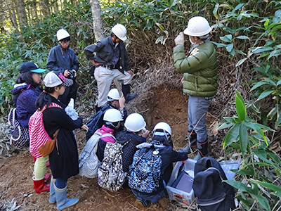 四国の風土に密接に関連した地すべりの実態、およびわが国を代表する活断層である中央構造線による地形変化などを理解してもらうため、2015年に引き続き、2016年も開催し、当日は11名の参加がありました。まず、徳島地すべり観測所に集合し、パネルなどにより観測所を説明し、四国の地質・地形および地すべり分布図を紹介した上で、ボーリングで抜き取ったコア試料を用いて、地すべり土塊の特徴を解説しました。その後、長期かつ高密度で地すべり計測を行っている西井川地すべり地において、地すべりの地質・地形・変動特徴を紹介し、種々の地すべり観測機器を説明した上で、リアルタイムで観測した微動、および参加者のジャンプで起こした地震動の観測・解析を行いました。 最後に、中央構造線による池田町における地形変化、および断層露頭を見学しました。参加者は、研究内容や体験内容について熱心に質問し、大学の研究者と積極的に対話をして交流を深めました。また、参加者からは、「色々と体験できて、本当に勉強になりました」、「自分が住んでいる町に大学の観測所があり、地すべりの研究がされていることを今まで知らなかったので、驚きました」、「来年にも是非家族と一緒に参加したい」などの感想が寄せられ、イベントは好評のうちに終了しました。
