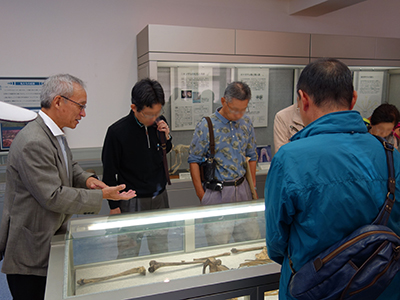 展示資料室で骨格標本を観察する参加者