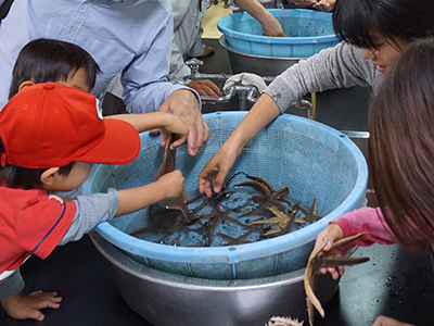 緑洋丸は、2015年12月に完成したばかりで、最新の航海機器や調査機器を備えています。今回のイベントは、この緑洋丸に体験乗船し、さまざまな機器を実際に使っているところを見学するとともに、底曳き網で舞鶴湾の生物を採集し、観察することを目的に行いました。船には定員があるため、今回は事前申し込み制とし、午前18名、午後19名が乗船しました。まず、乗船前に注意事項の説明があり、全員救命胴衣を着用した上で船に乗り込み、出港しました。船上では航海機器の説明、採水、採泥、水質測定、動物プランクトン採集、底生動物採集のデモンストレーションを行いました。約1時間の乗船体験後は採集物を実験室に運び、分類・観察を行いました。その後、参加者は実験室に展示されている水槽や標本を観察したり、膨大な魚類標本が収蔵されている標本庫を見学して自由に時間を過ごしました。今回は幅広い年齢層の方々が参加し、それぞれの視点でイベントを楽しみました。