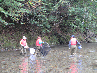 教員の指導による川魚調査体験