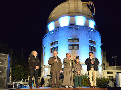 野外コンサートでは、毎年来られている世界的音楽家の喜多郎氏に加え、舞踏家の三上賀代氏も応援に来られました。秋晴れの満月の空のもと、宇宙のさまざまな映像と喜多郎氏の音楽「古事記」を合わせたDVD「古事記と宇宙」を天文台の建物に映しながら、喜多郎氏の生演奏や三上氏の舞踏が上演されました。一般公開では、宇宙に関する講演や、望遠鏡・観測装置の展示と解説のほか、4次元デジタル宇宙シアター、工作教室などの体験型企画、月・火星の観望なども行いました。ギャラリーウィークとして、若手絵画作家の吾郷佳奈氏と高原秀平氏による二人展「観測のレコード」を一般公開と合わせて行いました。参加者からは、「映像と音楽と星空で宇宙にいるかのような感覚を覚えました」(野外コンサート)、「古くからある施設や設備を大切にされ、今でも活躍させていることに感銘しました」(一般公開)などの感想があり、いずれのイベントも好評のうちに終了しました。