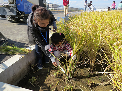 稲刈り体験を楽しむ親子
