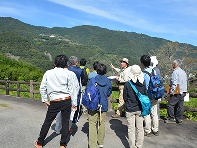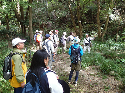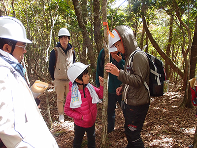このイベントは、本施設の存在および意義、教育・研究内容を、地域を中心とした一般市民の皆さまに知ってもらうことを目的に、2015年から開催しています。2016年は定員を上回る46名の応募があり、当日は21名の参加がありました。当日は、有田川町清水行政局駐車場に集合し、マイクロバスで林内に向かいました。現地では2班に分かれて、研究林教員および技術職員の解説により、主に標高の高い尾根部で自然観察を行いました。参加者は樹木の種名だけでなく、その生息地など生存戦略の多様性や、木材の資源としての利用と課題に関して理解を深めました。参加者からは、「植物の種類を多く知ることができた」、「講師の博学さに感心しました」などの感想が寄せられ、イベントは好評のうちに終了しました。