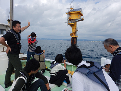 当日は、和歌山県内、大阪府から6名の参加がありました。まず観測所において、田辺湾湾口にある「田辺中島高潮観測塔」および観測船「海象」を用いた現地観測活動を概説した後、実際に観測船に乗って観測塔付近まで移動しました。観測塔の見学を行い、観測塔から戻る途中で水温・塩分濃度の観測体験を実施しました。観測結果については、観測所に戻ってからグラフを描いて説明を行いました。また、観測体験終了後、近隣の方23名を対象とした観測所の見学を行い、観測所の活動概要の説明と密度流に関する模型実験を行いました。