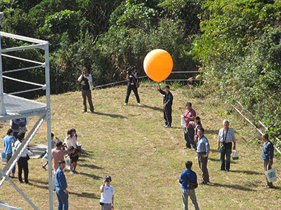 午前と午後の部を合わせて155名の参加がありました。当日は、研究所の教員による信楽とインドネシアにおけるレーダーを使った大気研究についての講演に続き、MUレーダーおよび各種大気観測装置の見学を行いました。最後に、気球に計測器を取り付けて放球するラジオゾンデ観測の実演を行い、上昇していく気球が見えなくなるまで観察しながら参加者との交流を深めました。参加者からは、「このような立派な施設が信楽にあるとは、全く知らなかった」、「今後の研究が天気予報に役立つことを願います」などの感想が寄せられ、好評のうちに終了しました。