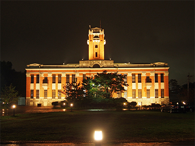 登録有形文化財建物である地球熱学研究施設本館のライトアップ