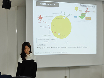 Puangphen Hongdilokkulさんは、ナノ構造の光触媒を用いたリグニンの高付加価値物質への変換について検討を行いました。P25への銀の担持について、種々の焼成条件を検討し、SEM-EDXによる表面元素分析、BET法による比表面積や細孔容積、細孔径の測定、光電子スペクトル測定によるエネルギーダイヤグラムの評価を系統的に行いました。まだ最適化するまでには至っていないものの、焼成条件を調整することで、リグニンの光触媒的な分解に有効な材料設計が調節可能であることがわかりました。