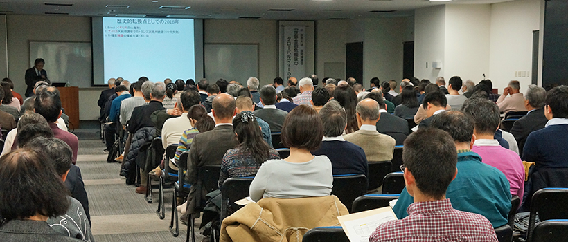 このたびは、静岡市のニッセイ静岡駅前ビルにおいて、岩本武和 経済学研究科教授が「世界金融危機後のグローバルマネーの行方 -おかねの流れから見る世界経済」と題した講演を行い、講演の後には、徳賀芳弘 副学長と岩本教授による対談および会場の参加者を交えて質疑応答を行いました。岩本教授は国際収支表の見方を詳しく説明し、日本、米国、中国の違いを解説した他、リーマンショック前後の欧米間の資本移動の変化、さらには近年の中国の資本移動の異変についても言及しました。講演会には、高校生、大学生の他、国際金融に関心の高い金融機関関係者など169名の参加があり、熱心に耳を傾けました。