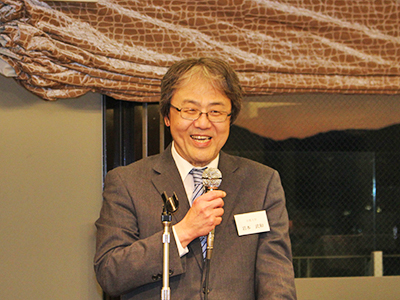 また、講演会終了後、同市内のホテルにおいて、静岡で同窓会活動をしている京友会が開催されました。65名の同窓生の参加があり、本学からは徳賀副学長、岩本教授および大学関係者が出席しました。最初に徳賀副学長、岩本教授の挨拶があり、続いて、高木明 幹事(医学部・1978年卒)の開会挨拶と乾杯の発声により開宴となりました。和やかな交流が進み、全員で「琵琶湖周航の歌」および「逍遥の歌」を斉唱し、盛会のうちに閉会となりました。