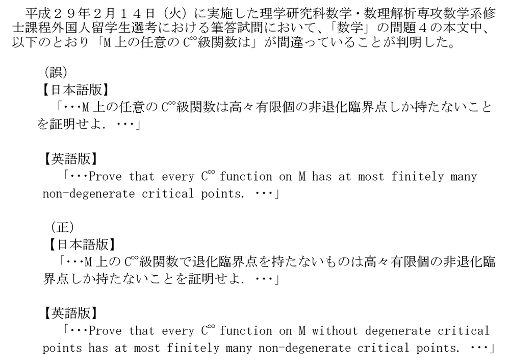 このたび、平成29年度理学研究科数学・数理解析専攻数学系修士課程外国人留学生選考の問題の一部に出題ミスがあることが判明いたしました。