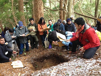 和歌山研究林における土壌断面観察の様子