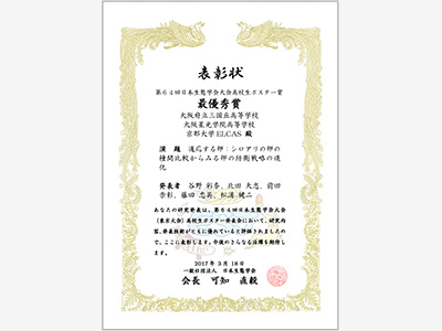 本学が推進する「科学体系と創造性がクロスする知的卓越人材育成プログラム(略称ELCAS)」の専修コース受講生が、早稲田大学早稲田キャンパス(東京都新宿区)において開催された、「第64回日本生態学会大会」高校生ポスター発表に参加し、最優秀賞を受賞しました。