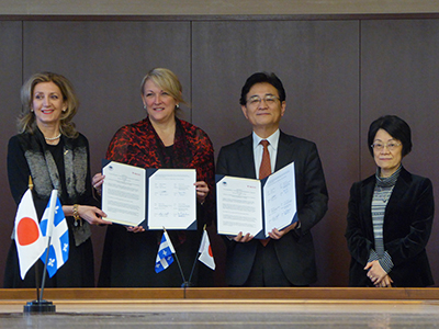 最後に、テリオー副首相立会いのもと、クレール・ドゥロンジエ ケベック州政府在日事務所代表と湊理事・副学長との間で合意書の文書交換式が行われました。