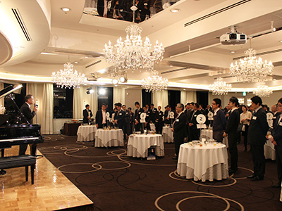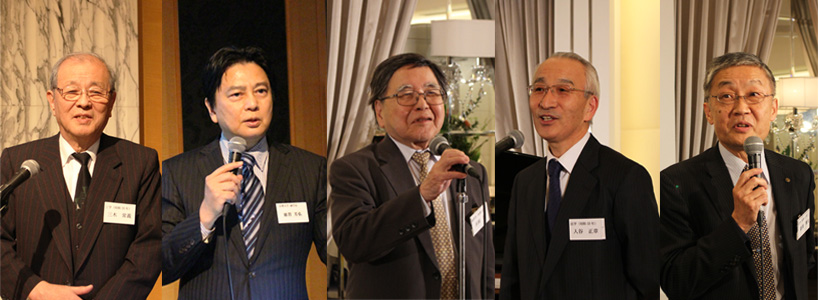 その後、会場を移動しての懇親会では、赤岡功氏(経済学部・1967年卒)、入谷正章氏(法学部・1974年卒)による3分間スピーチが行われ、三木会長の乾杯の発声により開宴となりました。