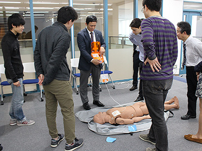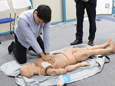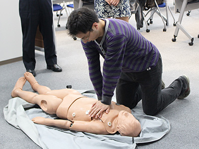 また、実際に人形を用いて、胸骨圧迫とAEDの使用方法も体験しました。 実際に体験してみると、講義を聞いていたはずなのに手順が曖昧になったり、胸骨圧迫の仕方にとまどったりと、習った技術を体験して覚えることの大切さを改めて感じました。 参加者からは、「どういった場合がAEDの使用対象になるのか」、「子供が倒れていた場合はどうしたらよいのか」等、活発な質問が飛び交いました。 約1時間のAED講習は、改めて人命救助について考えるきっかけともなり、有意義な時間となりました。