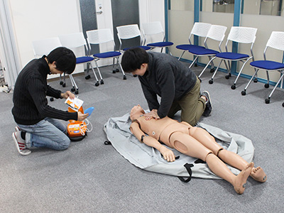 総合生存学館(思修館)は、2日間にわたり、新入生および在学生を対象としたAED講習会を開催しました。 講習会では、緊急時の救命措置の重大性とAEDを用いた救命措置の方法を学びました。 心肺蘇生実施の救命率は、5分間放置すると50%まで減少すると言われ、いかに早期救命が大切であるかを痛感しました。