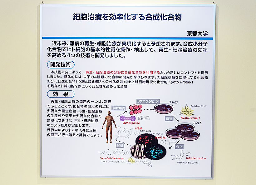 上杉副拠点長は、合成小分子化合物でヒト細胞の基本的性質を操作・検出して、再生・細胞治療の効率を高める、四つの化合物とそれを用いた技術を開発しました。(1)細胞移植を効率化する化合物、(2)分化促進化合物(心筋と膵β細胞への分化促進)、(3)ヒト幹細胞可視化化合物「Kyoto Probe‐1」、(4)残存ヒト幹細胞を除去して細胞移植の安全性を高める化合物 の四つです。化合物の最大の利点は、安価で大量生産が行えることです。再生・細胞治療は高価であることが問題の一つとなっていますが、化合物で治療を効率化できれば治療コストが軽減され、世界中のより多くの人々に治療の恩恵が行き渡ることが期待できます。