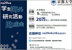 京都大学国際教育委員会国際学生交流委員会では、大学院生がフィールド調査や、国際学会での研究発表、海外での共同研究など研究目的で海外へ渡航するにあたり、学生海外研究活動助成金として資金を支援します。