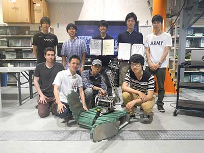 工学研究科修士課程2回生の竹森達也さんら9名の学生で構成されるレスキューロボット開発チーム「SHINOBI」が、レスキューロボット「FUHGA(フウガ)」を開発し、愛知工業大学にて行われたロボット競技会「ロボカップジャパンオープン2017 レスキュー実機リーグ」で総合優勝を果たしました。