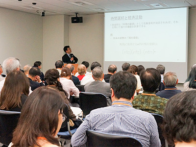 若井教授は、まず経済学における時間について、時間選好を例に挙げて説明しました。具体的には、時間選好の研究史に触れ、割引効用モデルという考え方が生まれるまでの各経済学者の時間選好におけるさまざまな見解を示し、経済学における時間の捉え方がどのように展開してきたのかを解説しました。そして、経済学において価値を見出す指標(経済学的価値の源泉)である消費について、時間選好と経済活動の実験例を交えながら、どのような影響があるか説明しました。さらに、不確実な現象がおこる確率が分かっている状況と分かっていない状況では、それに備えて消費を減らし貯蓄を増やす傾向にあるという不確実性の影響があることについても説明し、時間の経過に対して普遍的経済価値を客観的に求めることはできない等、経済学における時間の捉え方について述べました。