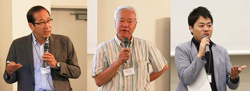 左から、開会の辞を述べる北川進 iCeMS拠点長、WPIプログラムの説明をする宇川彰 WPIプログラムディレクター、閉会の挨拶で謝辞を述べる鈴木教授