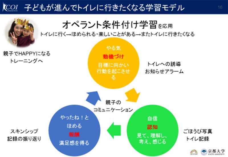 明和政子 教育学研究科教授は、COI拠点においてユニ・チャーム株式会社と共同で、日本のトイレトレーニング(以下、トイトレ)の実態に関する大規模縦断調査を行いました。その結果、子どもとコミュニケーションをとりながらトイトレを進めたいが、なかなか思うように取り組むことができない親の姿が明らかとなりました。そこで、親子ともにトイトレを楽しみながら達成感を得ることのできるアプリを発達科学の知見に基づいて開発しました。このアプリには、親子のコミュニケーションを促し、そのなかで子どもが進んでトイレに行きたくなる気持ちを高めるための学習モデルが組み込まれています。さらに、質問紙得点と生理的ストレス指標として知られる唾液中のアミラーゼ値の変化をアプリの使用前後で調べることにより、アプリの効果を検証しました。