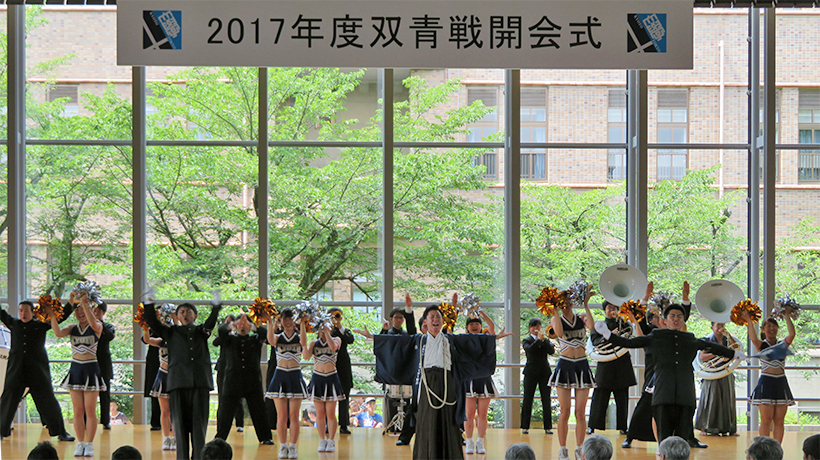 東京大学・京都大学の各運動部の総合対抗戦である双青戦の開会式を、本学の百周年時計台記念館百周年記念ホールにて行いました。