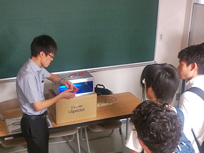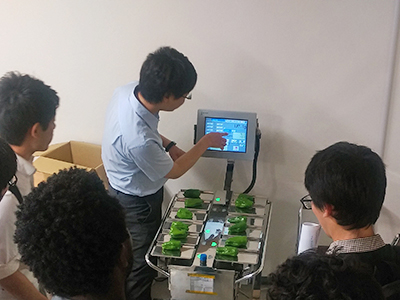 食品の業務用計量機器、包装機で国内でもトップシェアを持つ企業から講師を招き、講義を行いました。前半は講義形式で授業が進められ、後半では実際に流通している機器の実演が行われました。機器の実演では、刺身などの生魚を食べたときに、食中毒を引き起こす原因となるアニサキス(寄生虫)を、紫外線蛍光で検出する装置のデモンストレーションがありました。この装置は農学研究科地域環境科学専攻の生物センシング工学分野が企業と共同で開発したもので、学生は熱心に説明を聞いていました。また、食品計量にも実際に挑戦するなど、活気のある講義となりました。