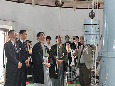 テープカットに引き続いて施設の内覧会を行い、柴田一成 理学研究科附属天文台長の案内のもと、望遠鏡や貴重な天体観測資料について、参加者は熱心に見入っていました。