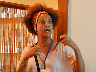 ミーティングは、稲葉理事・副学長による歓迎の挨拶で始まりました。後半には、今年度新たに入学した女子学生5名が、自己紹介を兼ねて現在の研究やアフリカでの活動について発表がありました。アジア・アフリカ地域研究研究科に在籍する大学院生Azeb Girmaiさんは、出身国のエチオピアで都市部のゴミの再利用を推進するNGO活動について発表し、経営管理教育部の山平泰子さんは、大学院に入学する前にルワンダの女性に縫製技術を伝えるNGO団体に携わり、使われなくなった着物の生地を新たに縫い合わせたドレスなどを写真を交えて紹介しました。