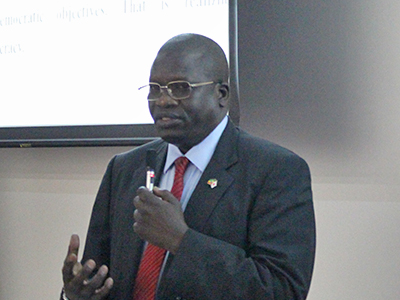 翌日7月7日には、アフリカ地域研究資料センターとアフリカ学際研究拠点推進ユニットの共催で、チャム大使による特別講演を稲盛財団記念館で開催しました。「エチオピア-日本の外交・政治・経済関係」と題した講演では、過去50年にわたる二国間関係の変遷に加え、アフリカ諸国の中でも高い経済成長率を誇るエチオピアの現状について紹介されました。質疑応答では、会場を埋めた約40名の参加者から質問が相次ぎ、活発な意見交換の場となりました。