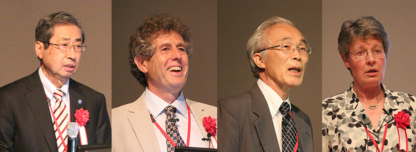午後の地球科学・宇宙科学分野のセッションでは、「地球・宇宙に対する新たな夢とロマン」をテーマに、平朝彦 海洋研究開発機構理事長、ティム・パーマー(Tim Palmer)オックスフォード大学王立協会(350周年記念)研究教授、小山勝二 名誉教授、ジョスリン・ベル・バーネル(Jocelyn Bell Burnell)オックスフォード大学教授の4名の講師が講演し、地球深部探査船、スーパーコンピュータといった最新のツールを駆使した地球深部観測や地上の気象予測に関する成果から、電波望遠鏡を駆使し、創意工夫を凝らすことにより発見した超新星やパルサーなど遠い宇宙の果ての出来事に至るまで、その有り様をつぶさに捉えることのできるようになった夢とロマンに溢れる世界について語りました。