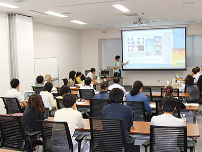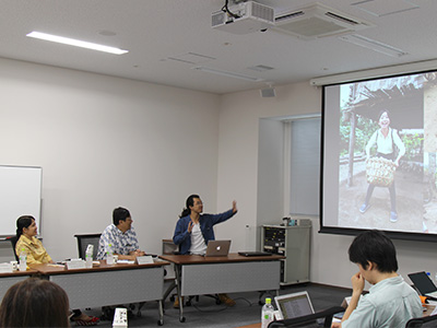 さらに同学館大学院3年生のパン宇年さんが、2016年度の海外インターンシップにおけるミャンマーでの活動の様子を写真と動画を交えて紹介した上で、参加した学生全員が、自己紹介と研究テーマの紹介をしました。