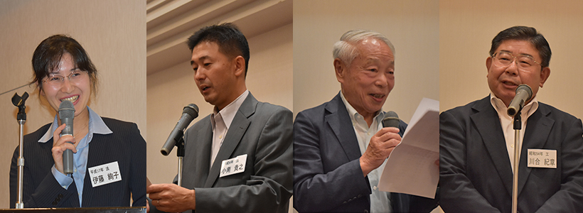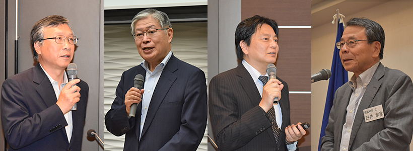 左から、司会の澤田事務局長、挨拶を行う横内会長、講演を行う徳賀副学長、乾杯の挨拶をする臼井副会長