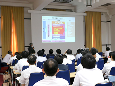第1部では、北野正雄 理事・副学長の開会挨拶を皮切りに、木南敦 理事補が本学における入試改革への取り組みについての説明を行いました。続いて、平成30年度入試より特色入試を新規実施する薬学部薬学科、工学部建築学科、物理工学科の概要について、各学部の特色入試担当者が説明を行いました。