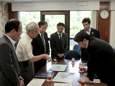 林大臣は、森田正信 理事、中川一 防災研究所長、大志万直人 同研究所教授・同センター副センター長及び、竹内英 文部科学省研究開発局地震・防災研究課長の出迎えをうけられた後、大志万教授・副センター長から、同センターが進める火山噴火機構の研究とその成果を応用した火山噴火予測及び火山浅部マグマ供給系とその構造に関する研究について概要説明をうけられました。