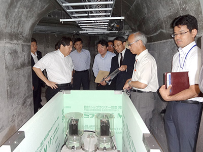 高免観測坑道にて水管傾斜計及び伸縮計の解説をうける林大臣