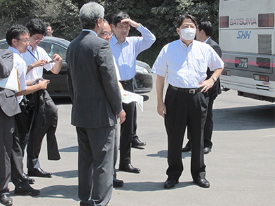 最後に、黒神地区にまわり、昭和火口から天を衝いて巻き上がる大噴煙を観察されました。当日は、夏の厳しい陽射しが降り注ぎ、路面に堆積した火山灰が車両の通行とともに視界を覆う条件下でありましたが、林大臣は約1時間の視察を精力的にこなし帰路につかれました。