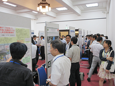 また、ポスター発表セッションでは、「環境保全・創造に関する研究・活動報告」をテーマに26題の発表がありました。発表された内容は、瀬戸内海・琵琶湖流域における水質構造や栄養塩動態、マイクロプラスチック、難分解性有機物の研究に始まり、地域活性化のためのローカルな取り組みの紹介や、植物プランクトン種組成と分布、ドローンを用いた特定種の生息域に関する研究、下水処理における分解特性の研究など、化学、社会学、生物学、工学と多岐にわたる発表を行い、活発な研究討議が各パネルにて実施されました。また、同日には、懇親会も行い、多様な研究者や行政関係者が集う中、有意義な情報交換の場となりました。